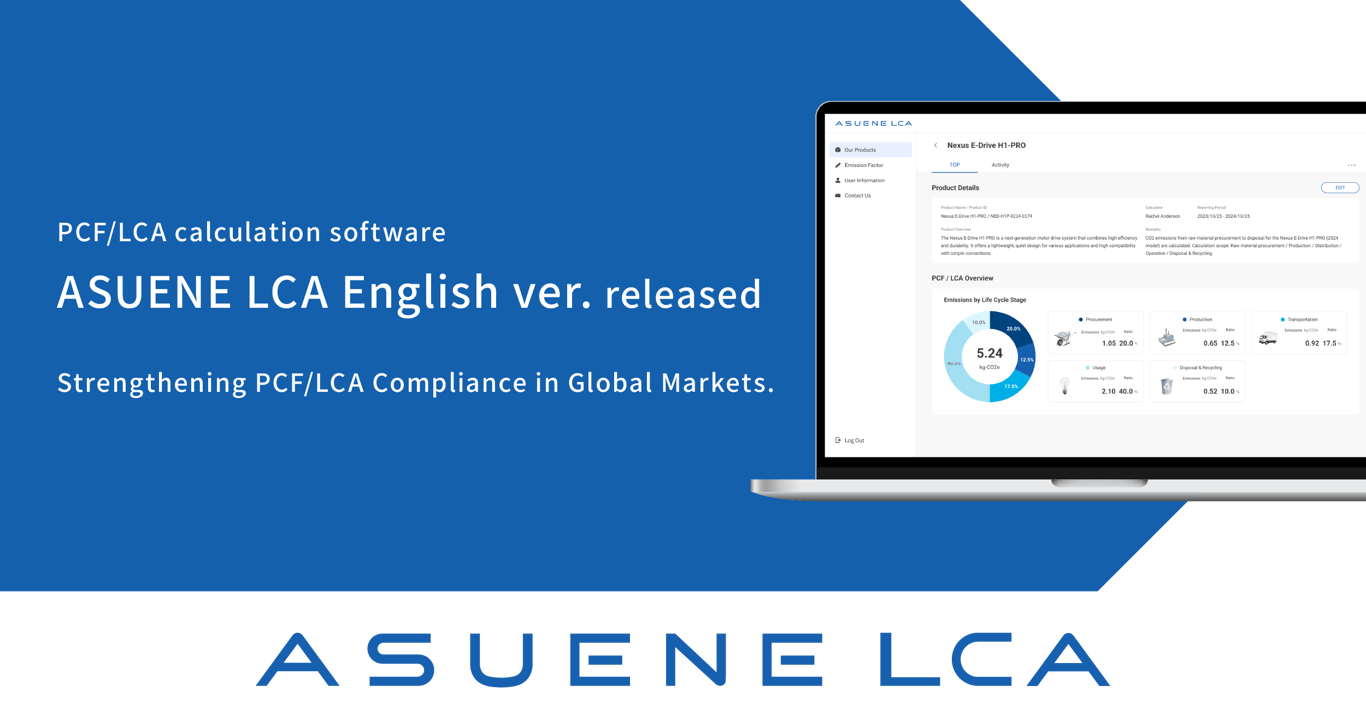 Asuene Inc. has launched the English version of its PCF/LCA calculation software, "ASUENE LCA." In response to tightening environmental regulations, particularly in Europe, this software was developed to support PCF/LCA calculation and disclosure in global markets. With this English version, PCF calculation becomes more accessible both domestically and internationally, while the collection of activity data and PCF data from overseas suppliers is streamlined.